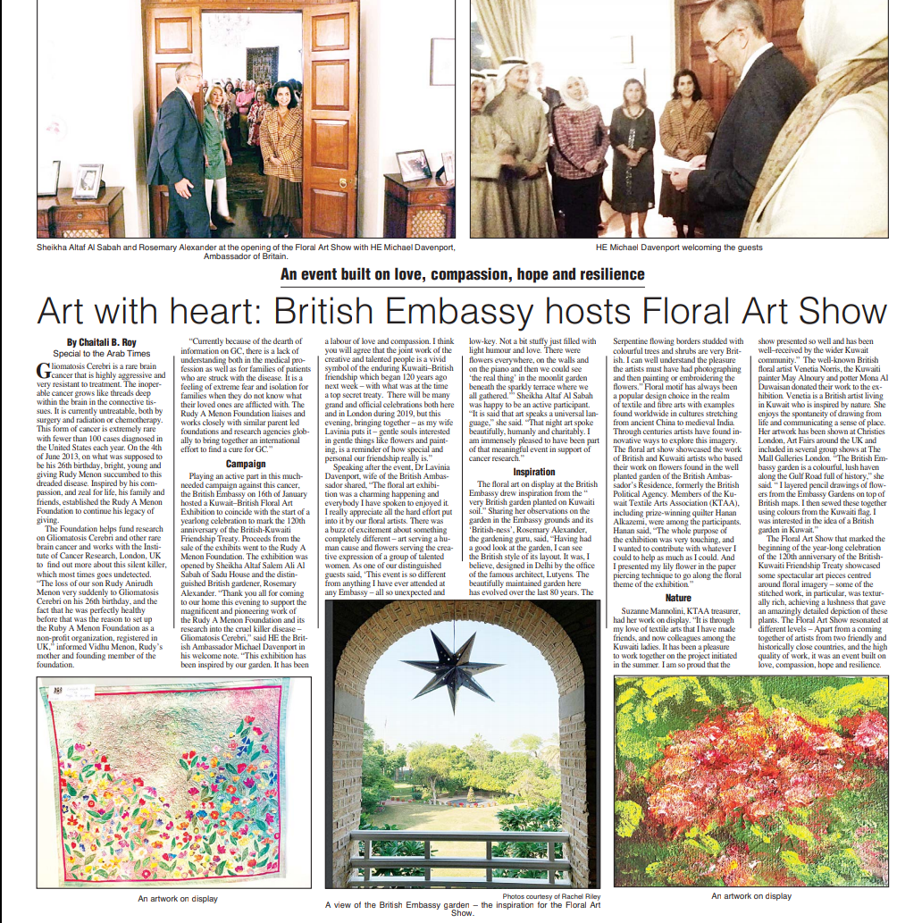 I created a series of work inspired by The British Embassy Garden in Kuwait. I layered drawings of flowers and plants from the garden upon maps of the United Kingdom and stitched them together using colours from the Kuwaiti Flag. This culminated in a sell out exhibition. Kuwait Television covered the exhibition and interviewed artists.